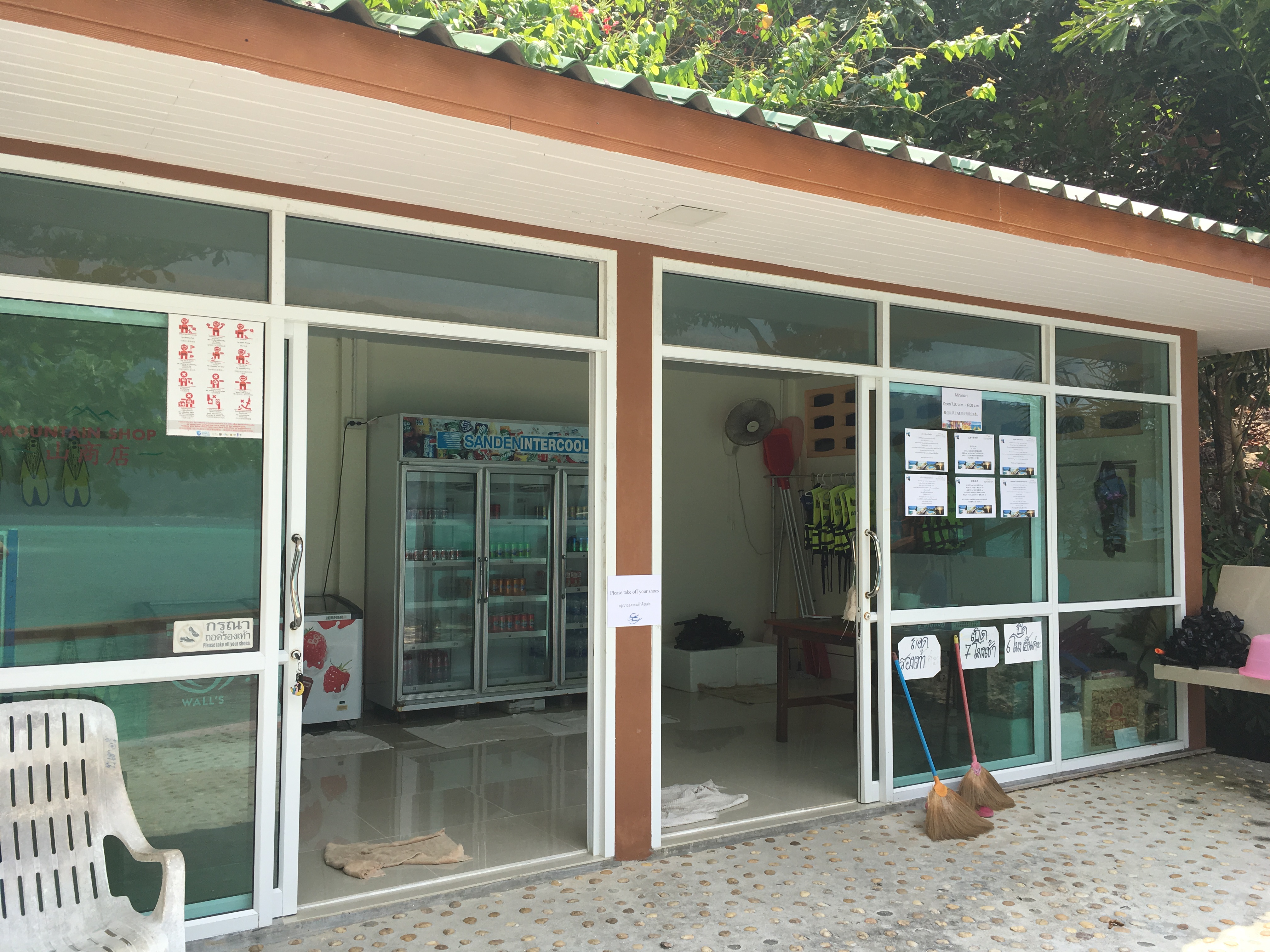 해변으로 내려오는 계단 중간에 물놀이 물품 대여소가 있다.